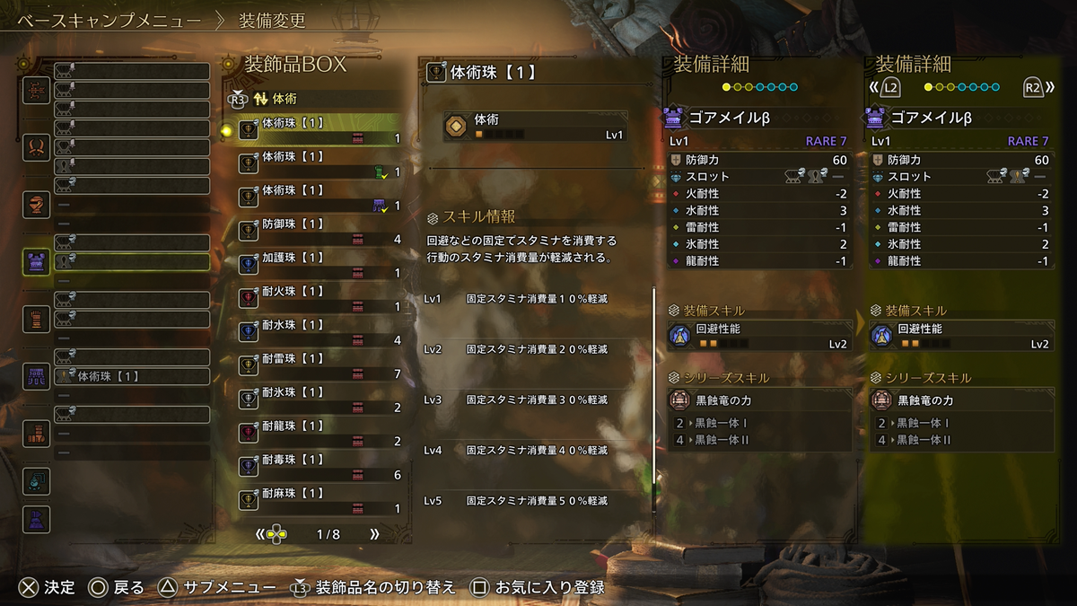 D「レ・ダウが苦手です!だからレ・ダウに対抗できるように雷耐性を上げたうえで、ピヨらないように気絶耐性を盛りたいです!そのモンスターに刺さるスキルが今は一番大切です!」