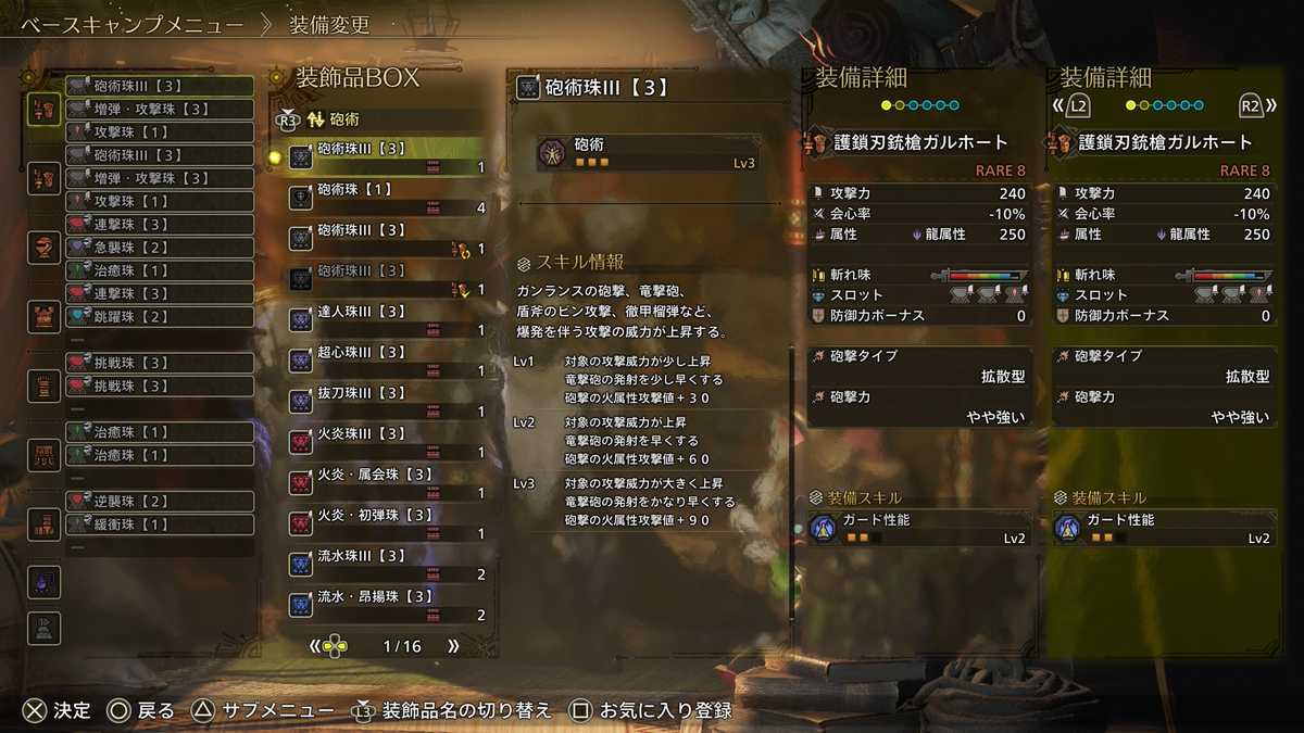 また一概に”火力が至高”と言っても、会心率をメインに考えるか属性をメインに考えるかでも変わってきますし、生存スキル一つとっても盾のある武器ならガード性能、盾のない武器なら回避性能、被弾してもダメージを抑える防御や精霊の加護と話が変わってきます。